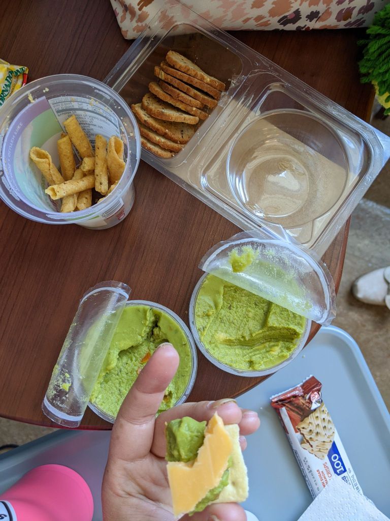 Today’s emotional support human was my friend Rosie. We got to experience a rare snack day! The snack bar had some new snacks including cookies and some sort of “pastry crisp” whatever that means. But the cran grape juice was back (that has been gone for WEEKS) and we got treated to two types of guacamoles for chemocuterie. Fancy!