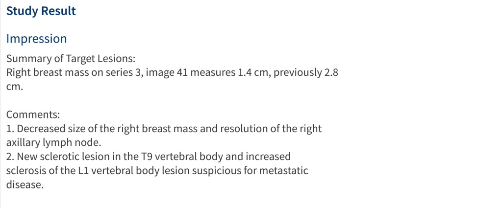 So. Let’s break this down. The good news is that the lymph node tumor is basically gone. I went from .9 cm to .3 (.35 inches to .11 inches) so it is weird it says it is resolved in the scan. To me, any disease left is NOT resolved, but who knows what this means in doctorland. The okay-ish news is that my breast tumor decreased by half. It went from 2.8 cm to 1.4 cm (1.1 inches to .55 inches.) I am not sure if this is going to please my oncologist or not, but I am guessing she wanted it to be smaller. We will see. And of course the bad news: increased lesions suspicious for metastatic disease on my L1 vertebrae and new lesions on my T9 vertebrae. If you recall from way back in March, we saw suspicious lesions in my scans, but they were too small to biopsy and I had started treatment. My oncologist said if it was cancer, the chemo would kick it. And here we are five months later and the lesions are growing and spreading. My oncologist was not in on Friday, so I am hoping she will review my scans this week and give me a call and not make me wait until August 26 when I am supposed to see her next to discuss next steps. Do we biopsy? Are they big enough to biopsy? Does she suspect they are cancerous? Why is it spreading? Should I be scared? I mean, I am scared. The scan does not report size, which makes me think that they are still too small to biopsy, but I literally know nothing so I really should stop assuming.
