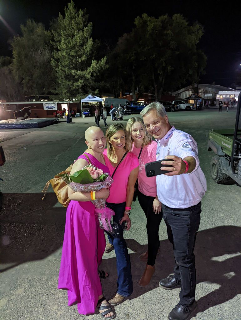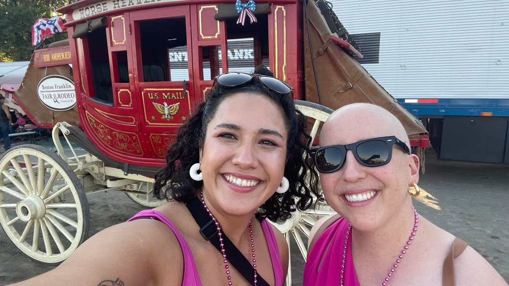 Keeping with the trend of blogging about things in reverse chronological order, Thursday I got to experience something I didn’t even know was on my bucket list but now is checked off: riding in the stagecoach during the rodeo at the fair! I was invited to represent the Tri-Cities Cancer Center at the Tough Enough To Wear Pink night at the rodeo! That invite included sitting in the fancy tent eating catered food and riding in the stagecoach as they read my bio to the audience. Talk about an insane honor! I felt like a little rodeo cancer princess. Oh and I got to bring Sue with me. We had a ton of fun and it was an experience I didn’t know was possible. My heart was overflowing with gratitude and we both felt like we were on a fun high, you know the kind that makes you giggle a lot and keep saying, “Wow, we are so lucky.” It was one of THOSE nights.