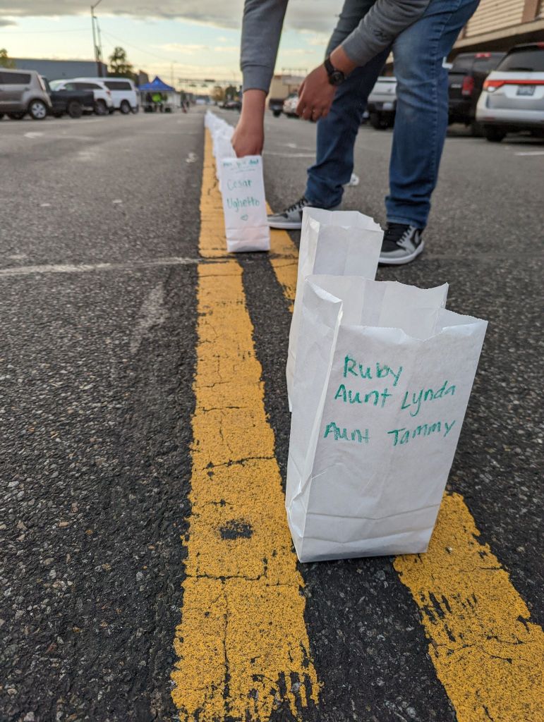 I summoned some of my friends to join me at this event yesterday. One of the things we received during sign up was a paper bag with a candle inside of it. It was meant for folks to write the names of loved ones who have passed away. Candles are really important for Día de los Muertos because they guide the souls home and light their way back. I wrote my dog’s and my aunt’s names on the bag, all who have passed this year from cancer. the bags lined the middle of the street leading up to the beginning and end of the race.