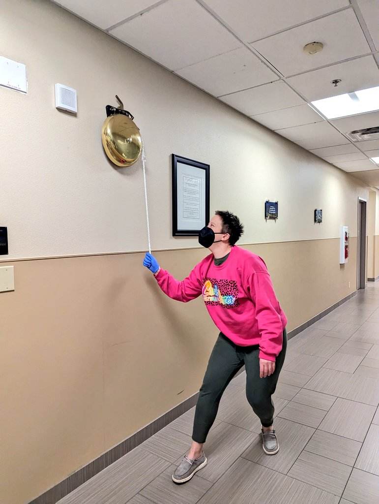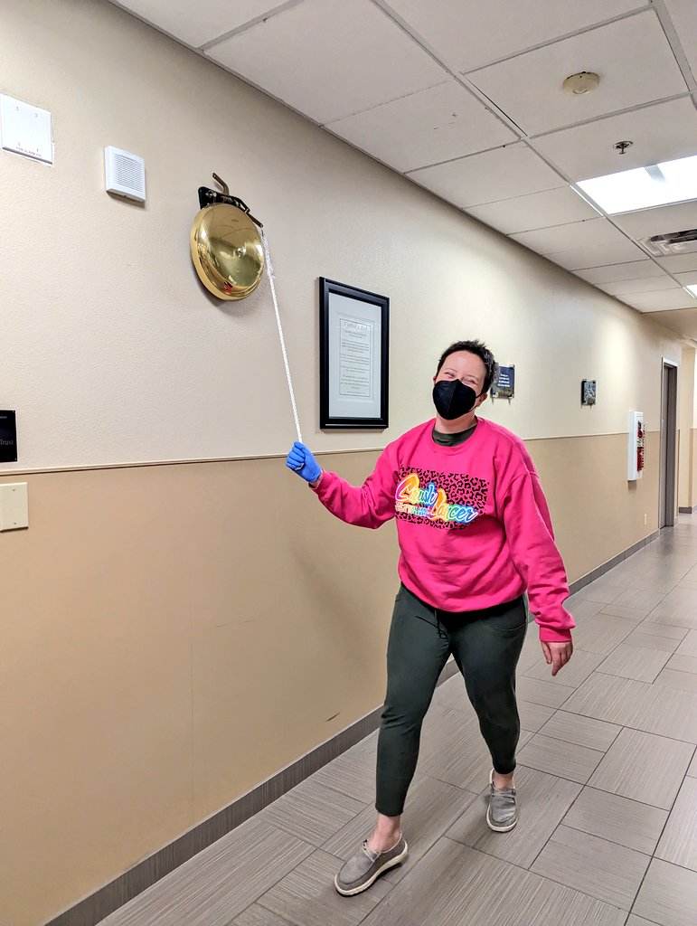 I was placed in a small room where patients wait at when they come in on the ambulance to wait for my non-assigned radiologist to basically look at me and tell me to go. The nurse came in to do my vitals and she was like, “Did you ring the bell already?” I told her someone said I couldn’t and she was like, “I have gloves. You can wear a glove.” So I wore a glove. I was the last patient in the building and my audience was just me, the nurse taking my photo, and two of the techs. They clapped and I heard the front desk folks cheering for me. It felt very anticlimactic but I got my ring.