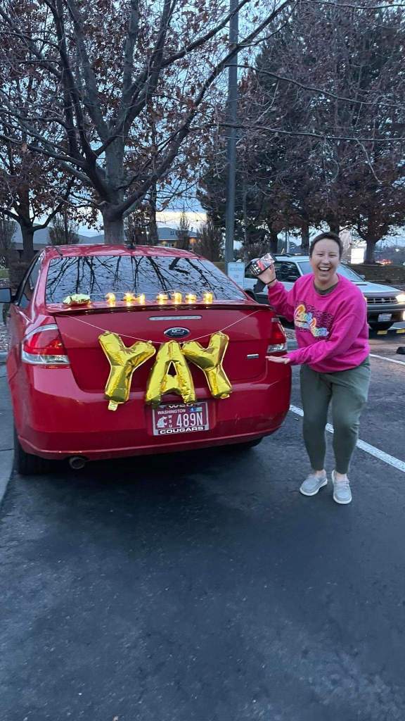 I came out to my car and my best friend Sue had placed some goodies on it. We social distance cheered and danced. I then met my sister after and she treated me to some to-go sushi. I was grateful that two people decided to show up for me but it also just made me feel sad.
