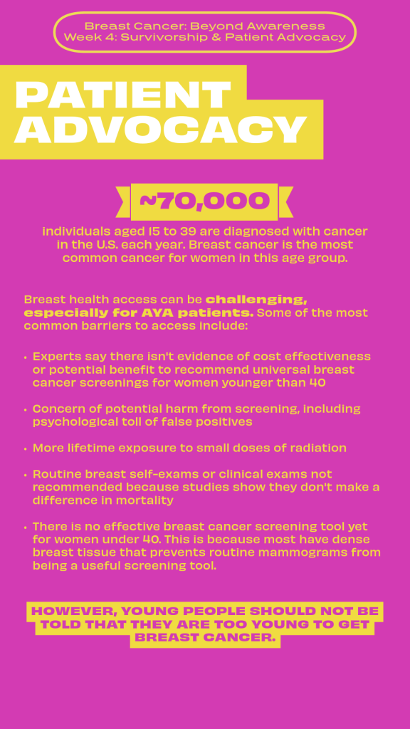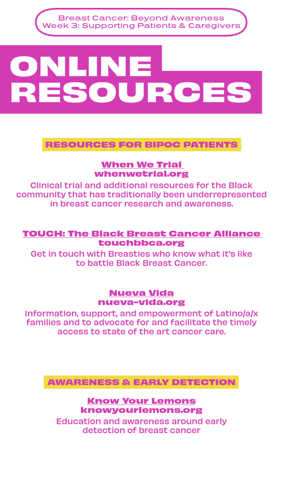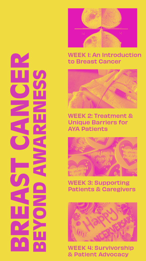 Alma’s Story | Week 1: An Introduction to Breast CancerOctober 9, 2023 | Week 2: Treatment & Unique Barriers for AYA PatientsOctober 11, 2023 | Week 2: Treatment & Unique Barriers for AYA PatientsOctober 14, 2023 | Week 2: Treatment & Unique Barriers for AYA PatientsOctober 16, 2023 | Week 3: Supporting Patients & CaregiversOctober 19, 2023 | Week 3: Supporting Patients & CaregiversOctober 21, 2023 | Week 3: Supporting Patients & CaregiversTiffany’s Story | Week 4: Survivorship & Patient AdvocacyOctober 26, 2023 | Week 4: Survivorship & Patient AdvocacyOctober 28, 2023 | Week 4: Survivorship & Patient AdvocacyAshley’s Story October 30, 2023